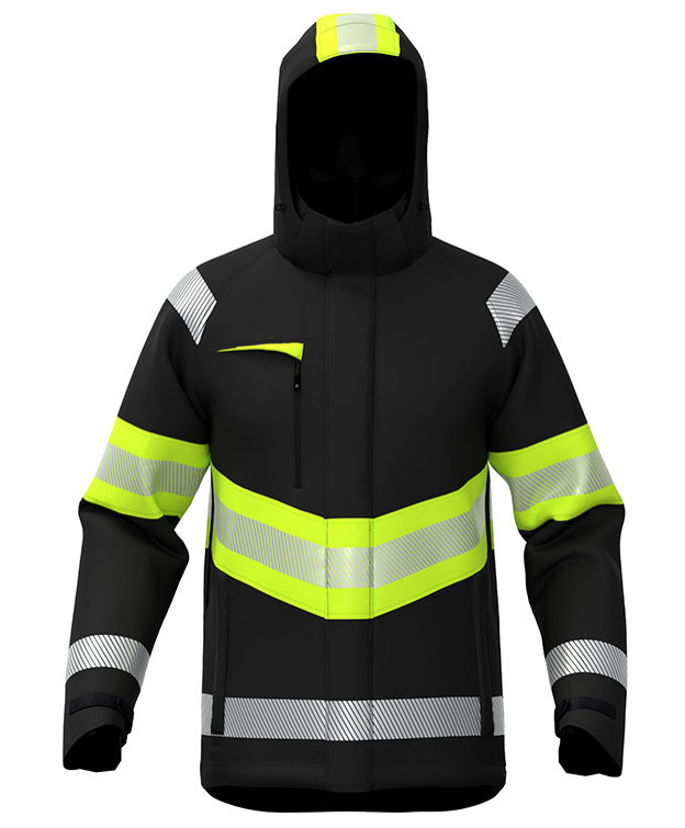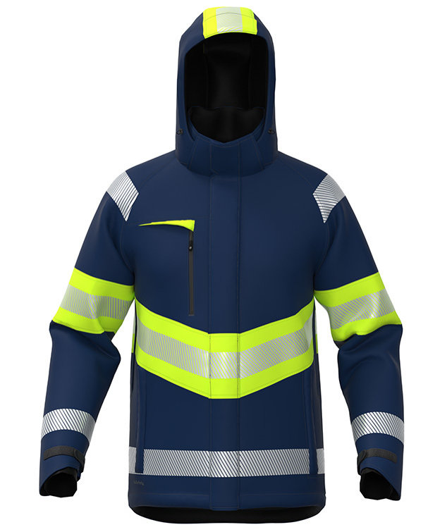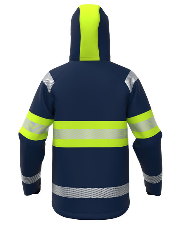 Warnschutz Winter-Softshelljacke • 3 lagige TPU Membrane, 8000 mm/5000MVP • Polyester Isolationsfleece • Polyester-Innenfutter • Belüftungszip unter den Ärmeln • abnehmbare Kapuze • Frontazip mit Patte, verdeckte Taschen an der Taille, Brusttasche mit Zip und ID-Kartenhalter, 2 Innentaschen • verstellbarer Ärmelbund mit Klettverschluss • verlängerter Rücken für zusätzlichen Schutz • Saum mit Zugkordeln verstellbar • Veredelungszip