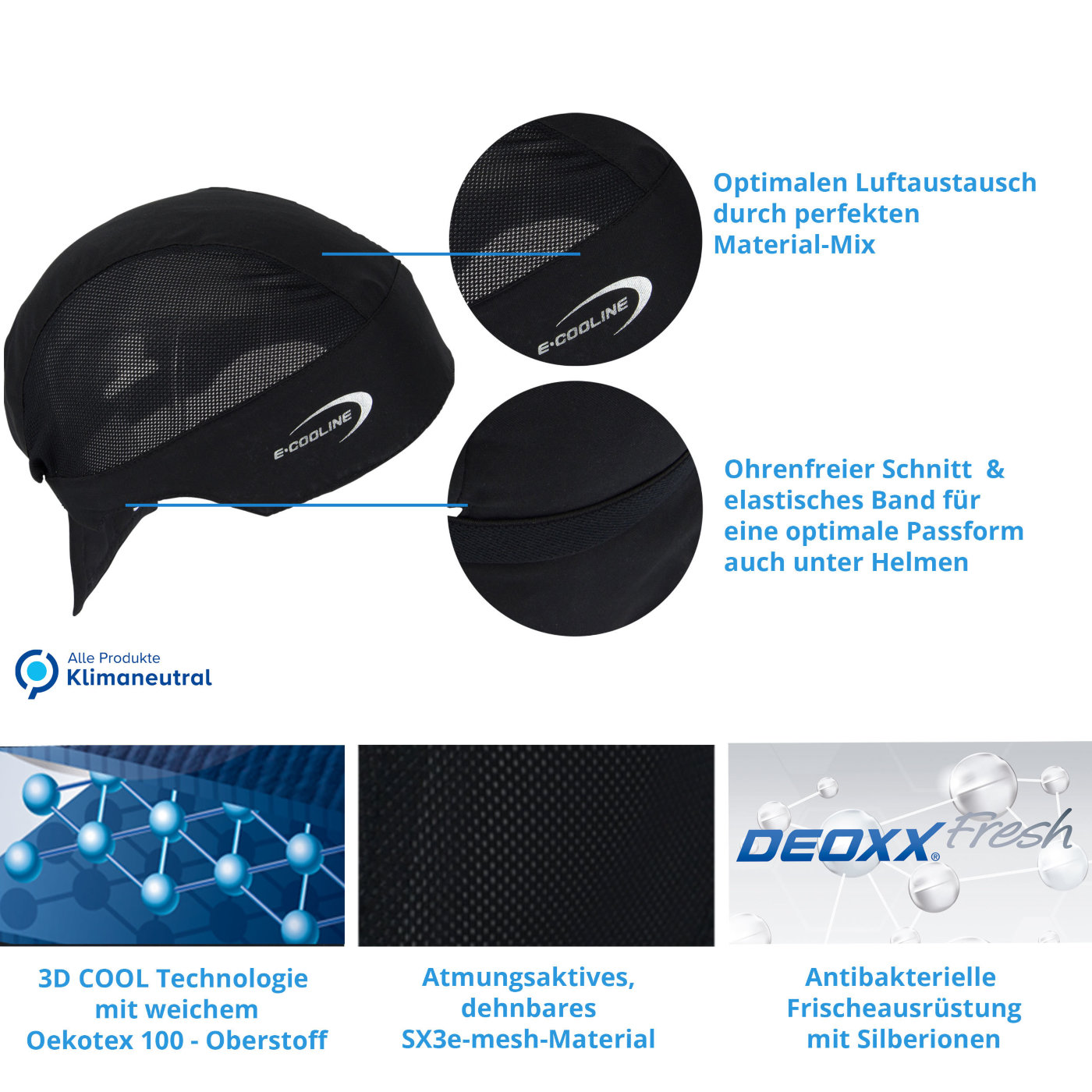 Kühlende Kopfbedeckung, auch zum Tragen unter Schutzhelmen und Antstoßkappen geeignet • leichtes, atmungsaktives E-Mesh-Material, COOLMAX-Fasern • Cooline® SX3 3D-Mesh Technologie • 660 Watt Verdunstungskühlung • Kühleffekt getestet und bestätigt vom HOHENSTEIN Institut, nach DIN SPEC 60015 • einfache und schnelle Aktivierung, Wasser drauf - einrollen- abtrocknen • angenehme Passform • hervorragenden Tragekomfort • waschbar bei 30° Grad, antibakteriell, hygienisch