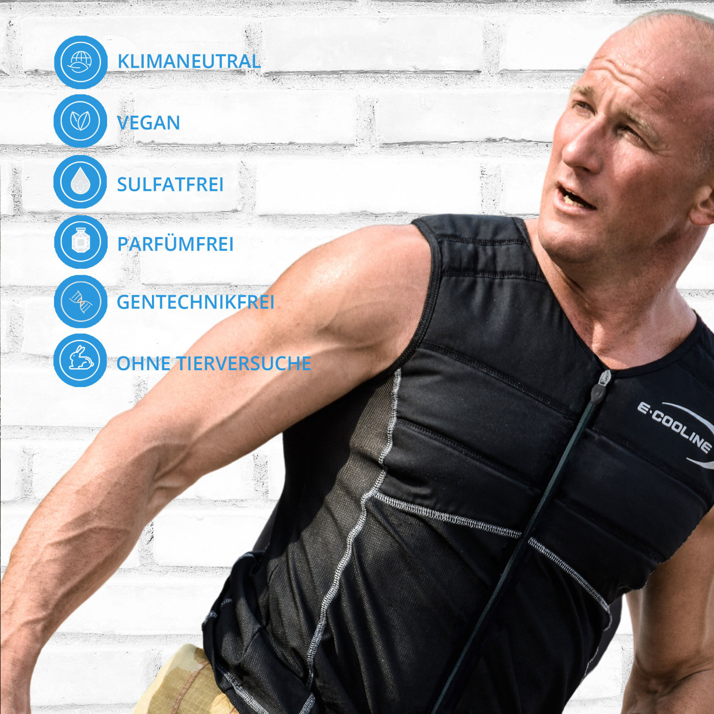 E.COOLINE® Kühl Shirt-Weste Powercool SX3 • ergonomische Passform • 25 Kühlpads mit Cooline® SX3 3D-Mesh Technologie • 660 Watt Verdunstungskühlung • Kühleffekt getestet und bestätigt vom HOHENSTEIN Institut, nach DIN SPEC 60015 • einfache und schnelle Aktivierung, Wasser drauf - einrollen- abtrocknen • waschbar bei 30° Grad, antibakteriell, hygienisch
