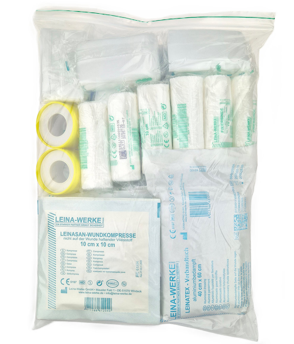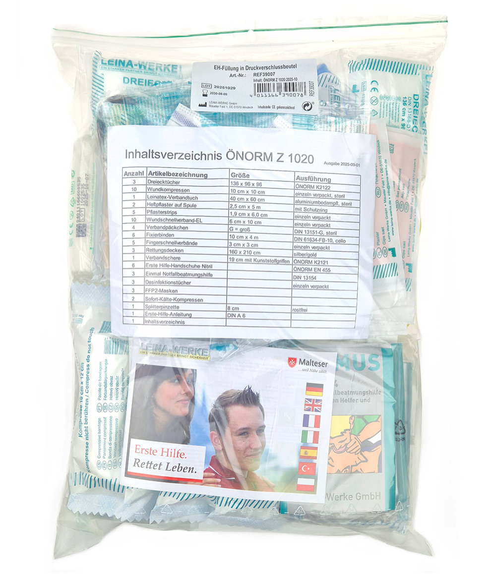 Erste Hilfe-Füllung nach ÖNORM Z 1020:2025 in Folientasche für Erste Hilfe Koffer.