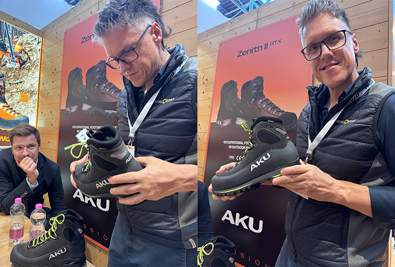 „Ob auf Baustellen oder im alpinen Gelände: Wir bieten ab sofort Sicherheitsschuhe von AKU®, dem italienischen Spezialisten für hochfunktionales alpines Schuhwerk. Natürlich haben wir bei der A+A die Gelegenheit genutzt und am AKU-Stand vorbeigeschaut.“